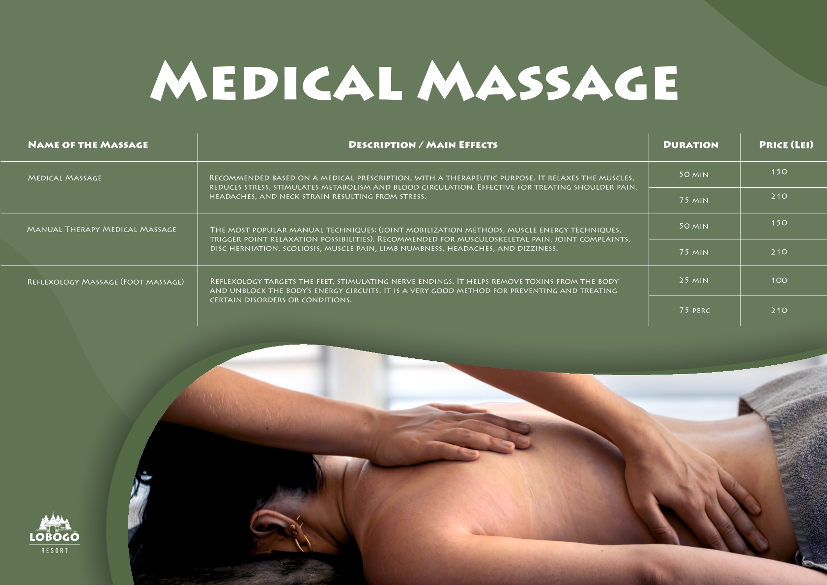 Masaj Terapeutic: Recomandat pe bază de rețetă medicală, cu scop terapeutic. Relaxează mușchii, reduce stresul, stimulează metabolismul și circulația sângelui. Eficient pentru tratarea durerilor de umăr, a durerilor de cap și a încordării cervicale cauzate de stres. Disponibil pentru 50 de minute (150 Lei) și 75 de minute (210 Lei).