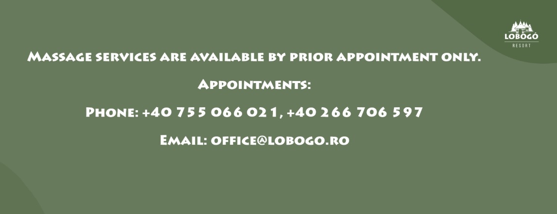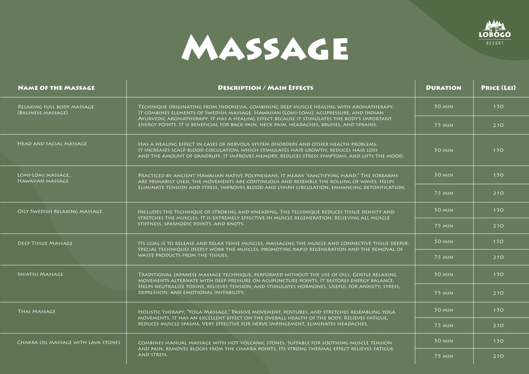 Masaj Lomi-Lomi, masaj hawaian: Practicat de polinezienii nativi antici din Hawaii, înseamnă „mână care sfințește”. Se folosesc în principal antebrațele, mișcările sunt continue și se aseamănă cu valurile care se rostogolesc. Ajută la eliminarea tensiunii și a stresului. Îmbunătățește circulația sângelui și a limfei, sporind detoxifierea. Varianta de 50 de minute costă 150 Lei, iar cea de 75 de minute 210 Lei.