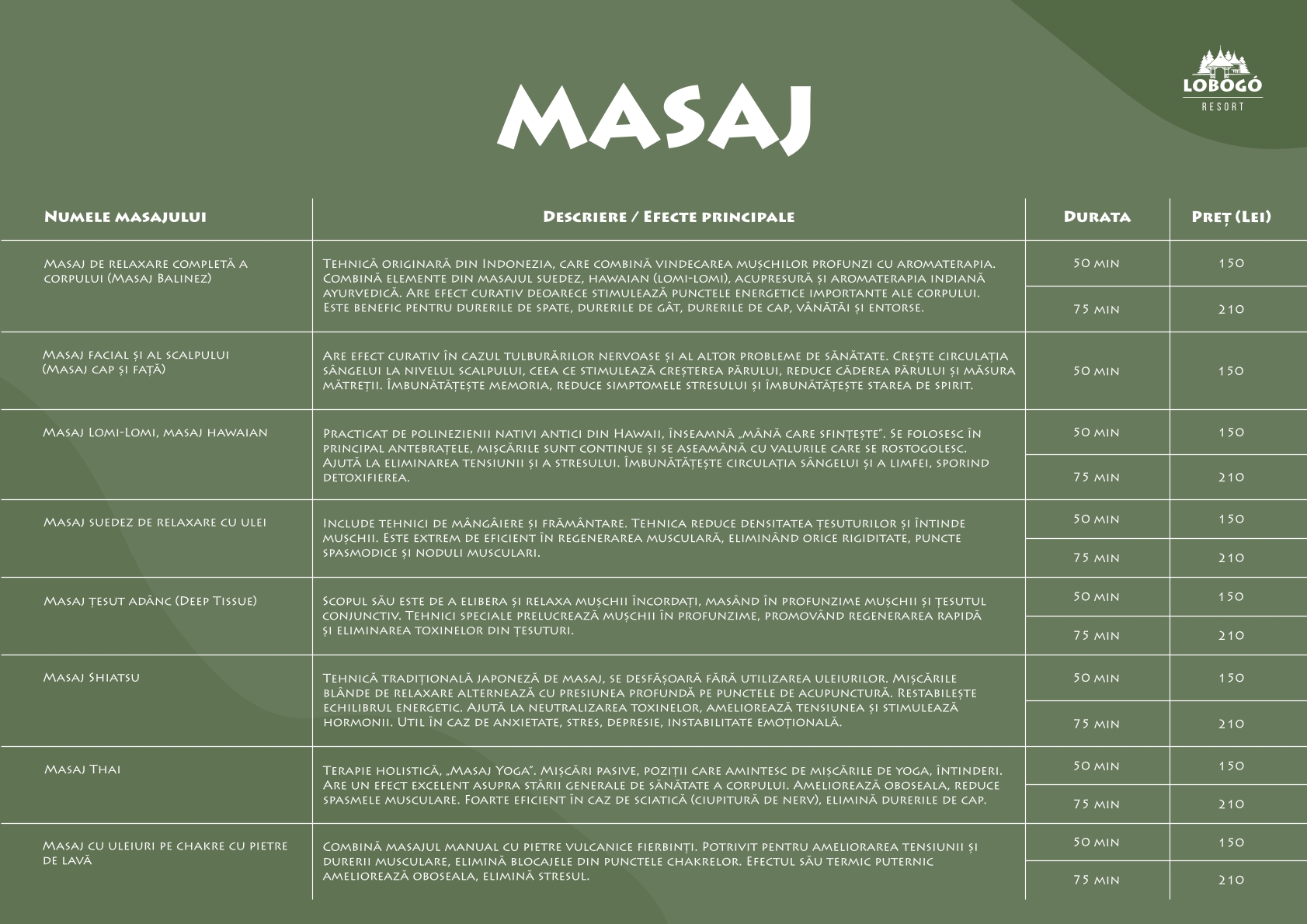 Masaj Lomi-Lomi, masaj hawaian: Practicat de polinezienii nativi antici din Hawaii, înseamnă „mână care sfințește”. Se folosesc în principal antebrațele, mișcările sunt continue și se aseamănă cu valurile care se rostogolesc. Ajută la eliminarea tensiunii și a stresului. Îmbunătățește circulația sângelui și a limfei, sporind detoxifierea. Varianta de 50 de minute costă 150 Lei, iar cea de 75 de minute 210 Lei.