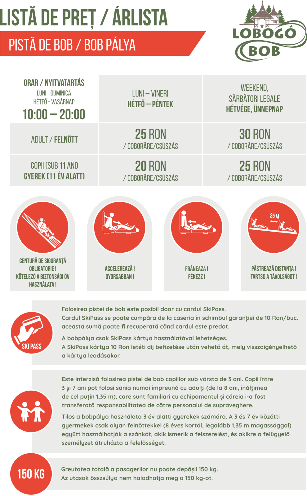 Itt van néhány fontos információ és jellemző a Lobogó Bob-ról: A Lobogó Bob pálya közel 1000 méter hosszú, ami azt jelenti, hogy hosszú és élménydús csúszásra számíthatsz. A pályán akár 45 km/h sebességgel is száguldhatsz lefelé, így garantáltan adrenalinteli élményben lesz részed. A pálya egyedülálló tervezésű, és négy izgalmas spirált tartalmaz, amelyek még inkább fokozzák az élményt. Ezek a spirálok fordulatokat és kanyarokat adnak hozzá a csúszásodhoz. A pálya hétfőtől vasárnapig 10:00 és 18:00 óra között van nyitva. Nincs szükség foglalásra, az érkezési sorrend alapján fogadják a vendégeket. Az árakat a lenti táblázatban találják. A Lobogó Bob egy fantasztikus élmény, amelyet a család és a barátok együtt élvezhetnek. A sebesség, a kanyarok és a spirálok garantáltan izgalmas pillanatokat nyújtanak, és emlékezetes élményekkel gazdagítanak. Ne hagyd ki ezt a kivételes kalandot, amikor Homoródfürdőn jársz!