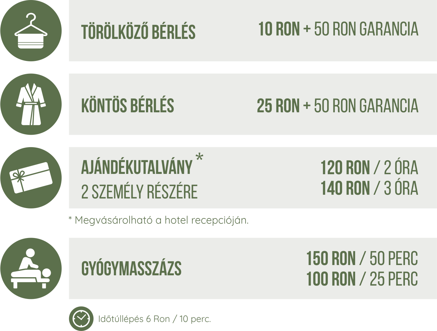 În baia noastră cu săruri avem apă sărată naturală, cu efecte terapeutice, adusă din Praid, menţinută la o temperatură de 37 °C. Dimensiunile bazinului mic sunt de 4 x 5 m, cu o adâncime de 140 cm, iar noul bazin, mai mare, are dimensiuni de 5,4 x 6 m, însumând aproape 33 m². Pe lângă numeroasele efecte terapeutice, apa este recomandată în caz de reumatism, afecţiuni articulare și vasculare, precum și pentru relaxare.
